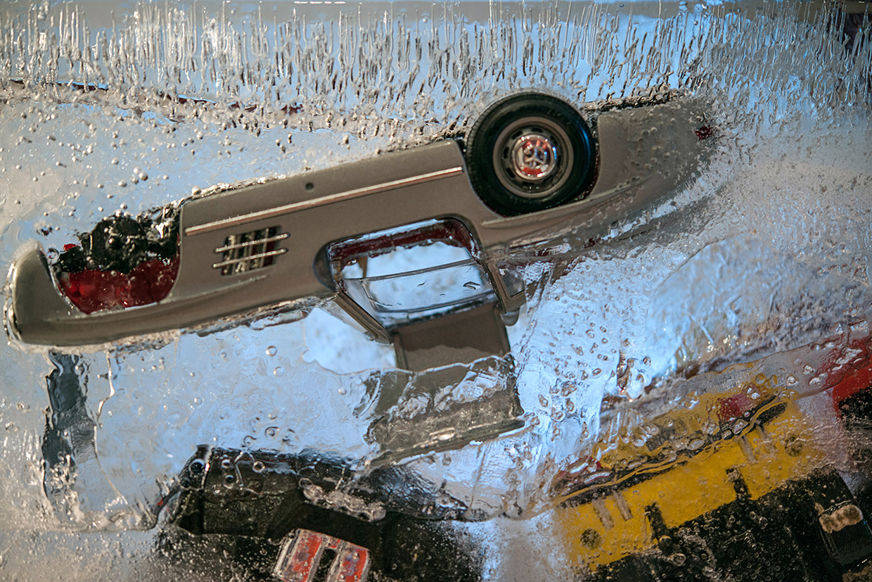 In Momentum, I first create a micro landscape in an ice block, in which I enclose miniature cars, cars that are now unable to move. As if someone had pressed pause and they, while on the move, suddenly froze and remained motionless, as if hovering in the air. This pause, this moment in time, is suddenly inscribed in the body of reality and creates a notch, irreversible and indelible in time, since what is written, cannot be written off, its trace always remains engraved. Thus, with cars stuck in the ice, we have at the same time the momentum of the event and simultaneously the “expansion” of the time of the event, which is constantly shifted and spreads in perpetuity.