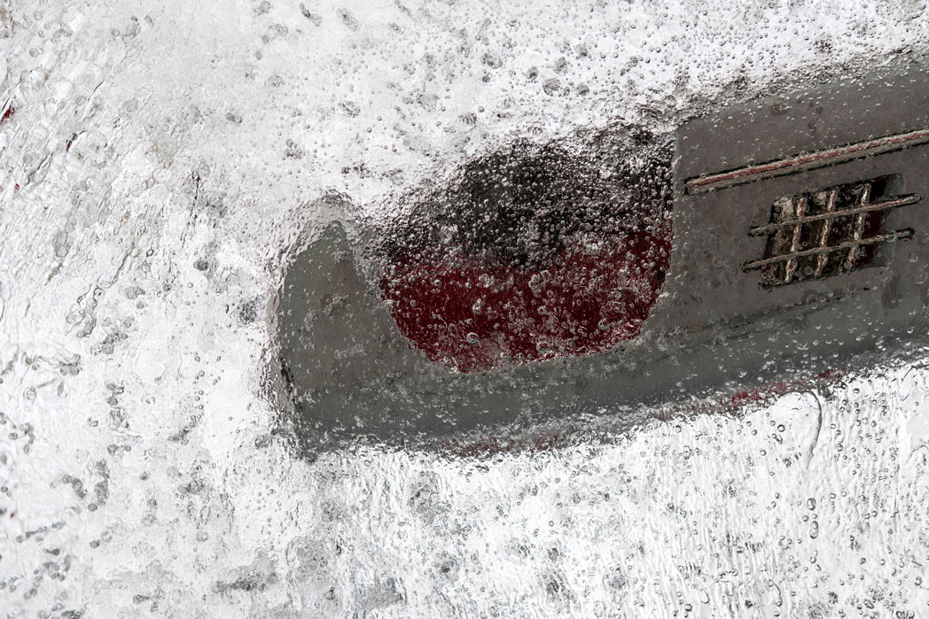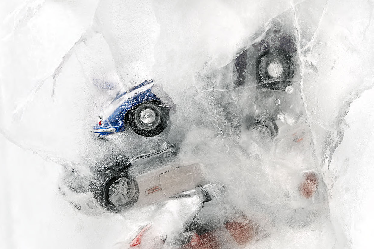 As with the passage of time, the ice, the carrier of the ephemeral nature of things, will be liquefied and melted, I photograph the frozen cars aiming to capture the border where the momentary and the eternal meet. This paradoxical pairing of the expansion of the fleeting moment of time, is in turn trapped in the lens and re-registered as part of our memory and identity. This moment that can never be repeated unaltered but leaves on us such indelible marks and feelings, that it impresses upon us and follows us until the end.